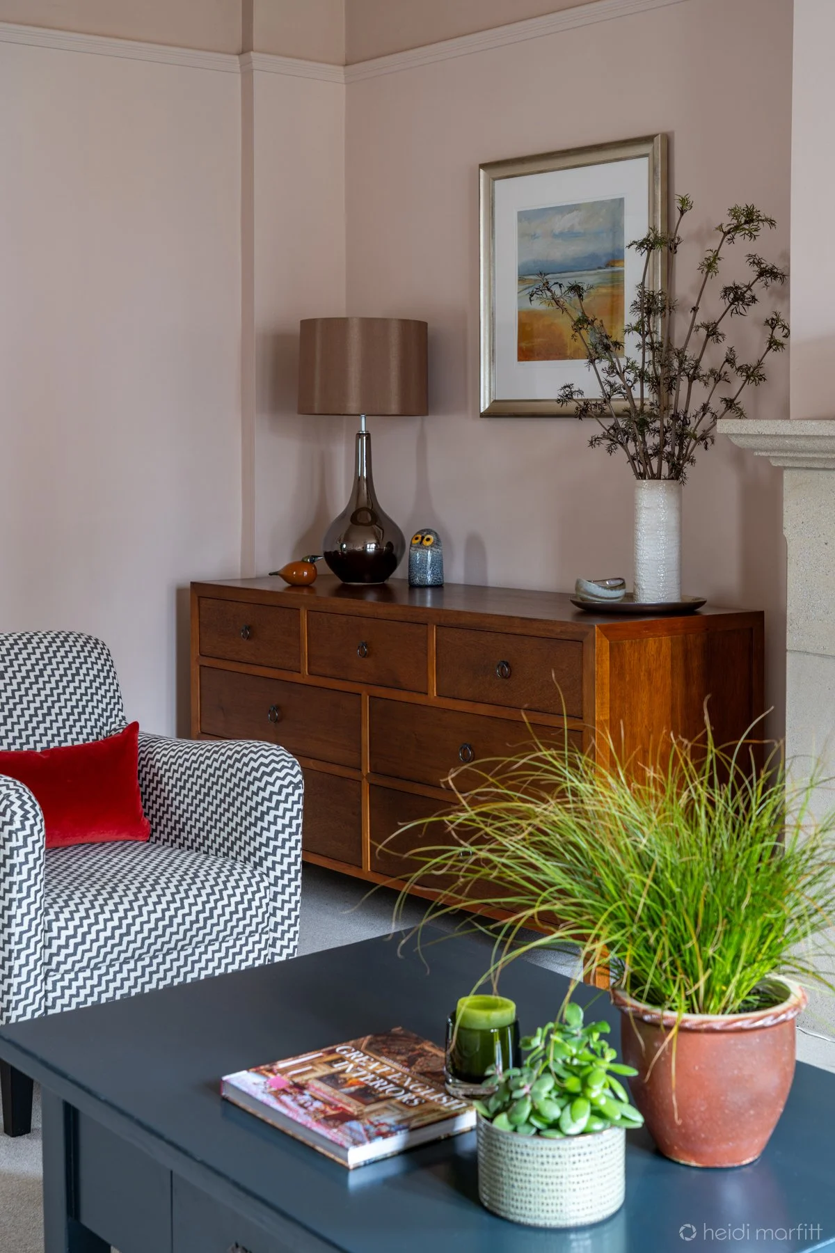 The existing grey walls and and white ceiling in this North facing room felt dull and depressing, and our client disliked spending time in there. They also wanted to replace some furniture, but retain the existing carpet, and curtains and were struggling to know how to make it all work together.