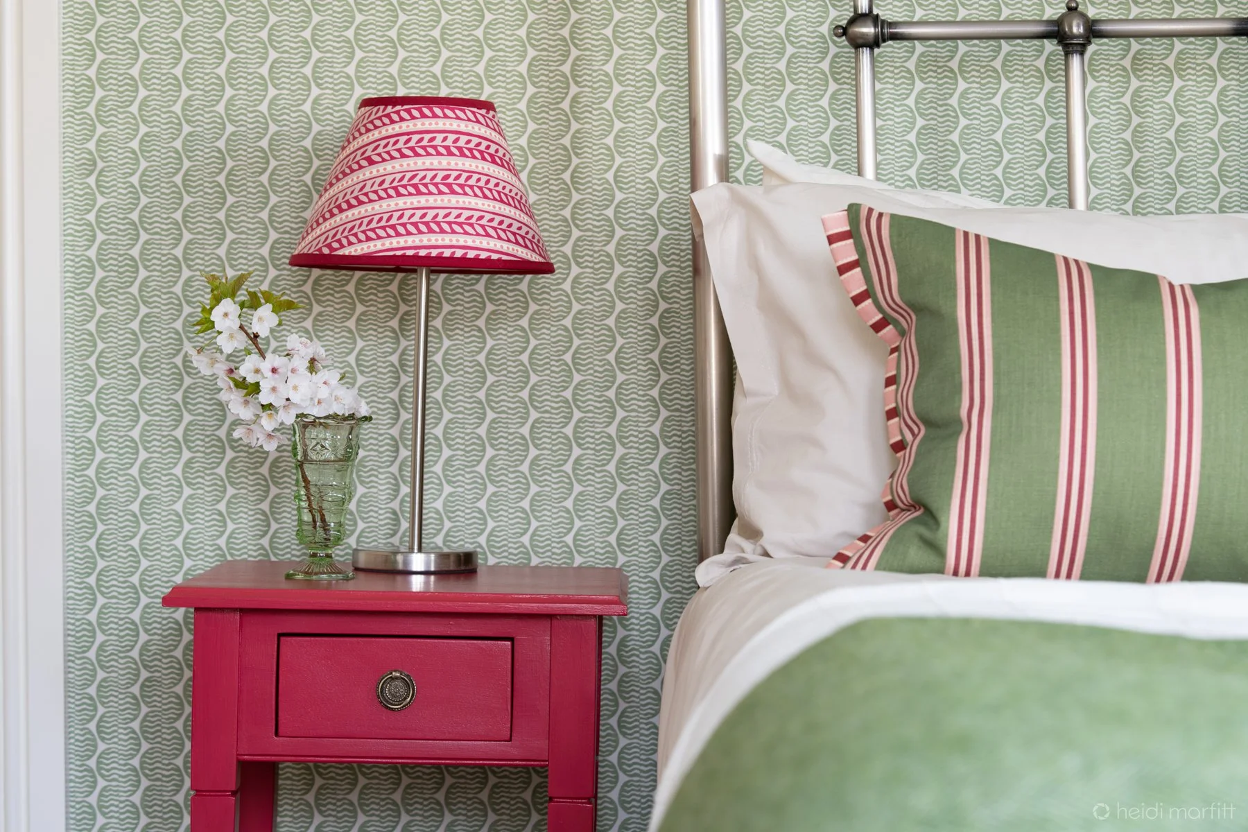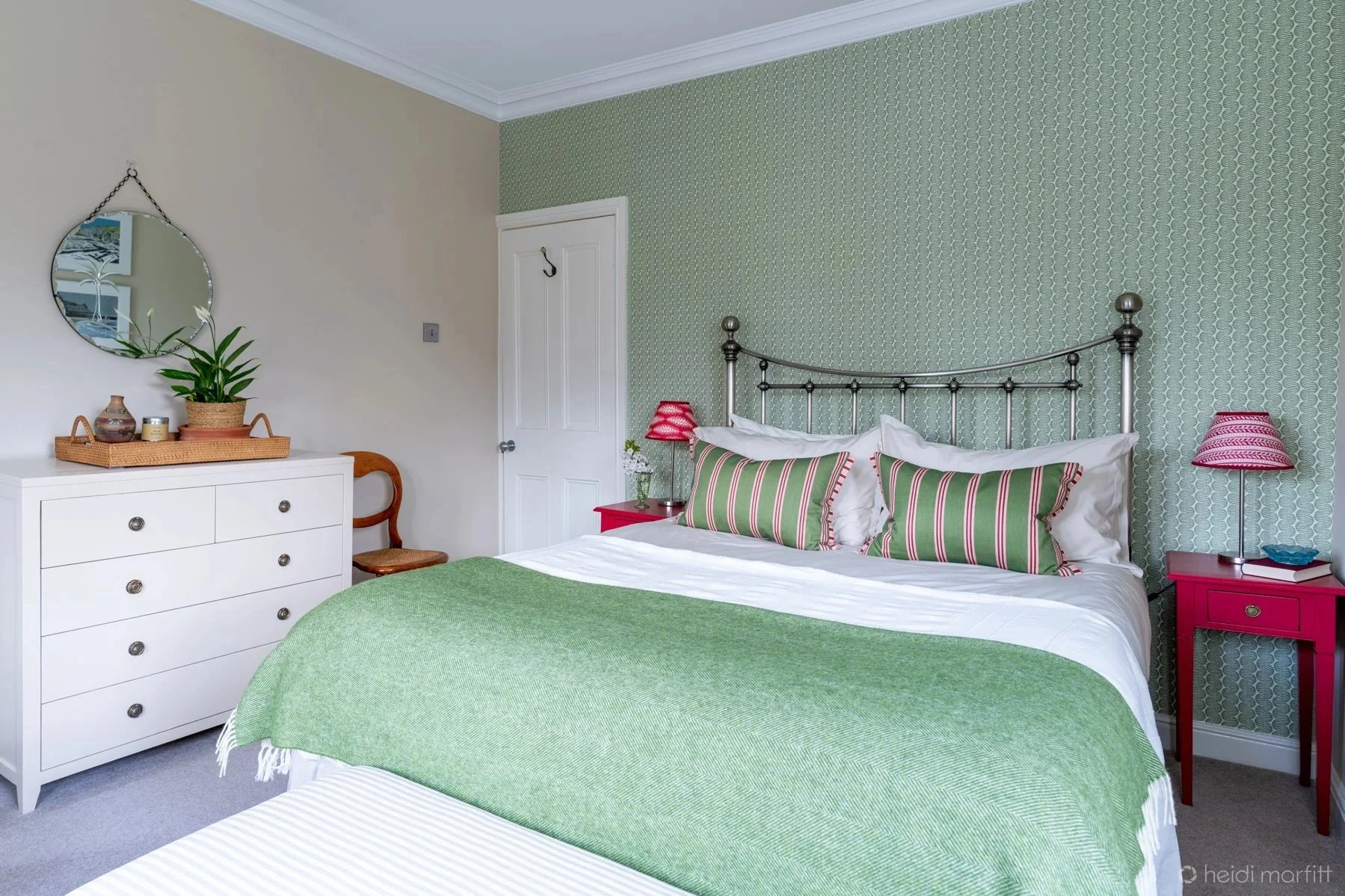 As the dual aspect room looks onto mature trees we used this as the inspiration for a nature inspired room with warm taupe and creams, adding contrast with a charming green wallpaper. The contrasting red bedside tables were painted a bespoke colour and we hand made the lampshades to add a quirky contrast and really make this a unique room.